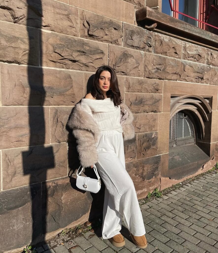 @ dilekpacaciogluSheās all about cozy-chic in a plush taupe faux fur coat layered over an off-shoulder white top and flowy white pants. This snug neutral palette is both elegant and effortless for winter outings!