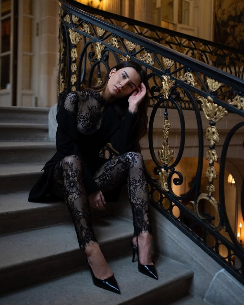 @ lucygrasssoSheās turning heads in a striking black lace bodysuit, perfectly layered under a classic black blazer for that sultry-yet-elegant vibe. This look is bold, feminine, and effortlessly chic for those glam winter evenings!
