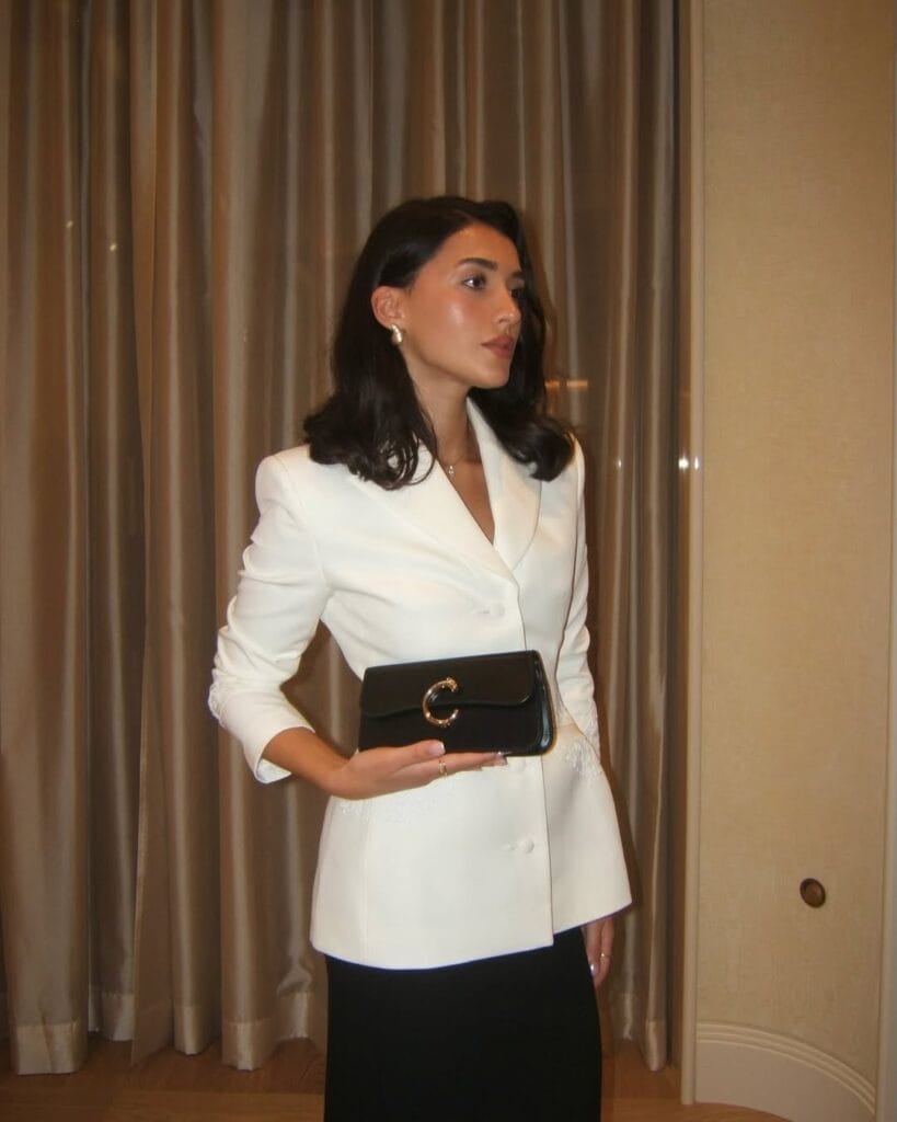 @ sherienboniSheās rocking a classic white tailored blazer paired with a sleek black maxi skirt for a super polished winter party look. The clean lines and bold contrast totally give boss energyāso chic for fancy evenings!