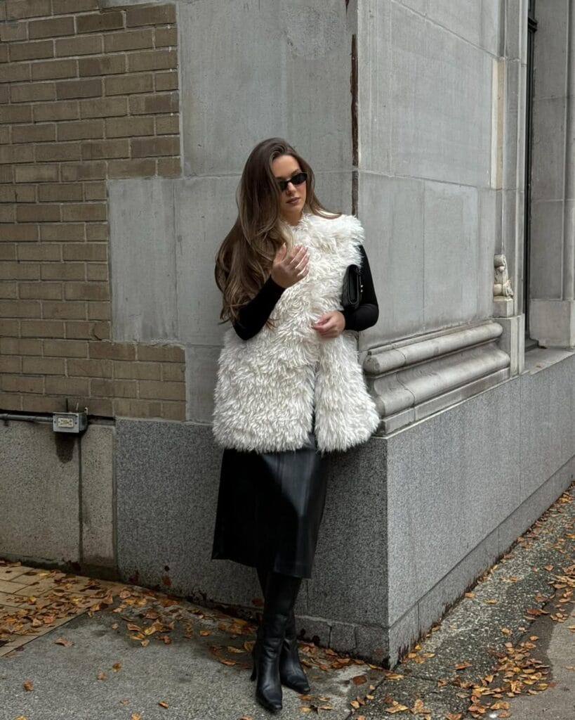 @ sophiesuchanSheās keeping it effortlessly cool in an oversized, fluffy white shearling vest layered over a sleek black turtleneck and a chic black leather midi skirt. The tall black boots finish the lookāsuper cozy yet polished for winter days in the city!