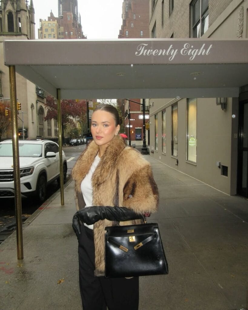 @ sophiesuchanSheās got that old-school glam in a plush brown fur coat layered over a simple white tee and classic black wide-leg trousers. Sleek black gloves give it that extra sophisticated, retro edgeāso chic for winter events in the city!
