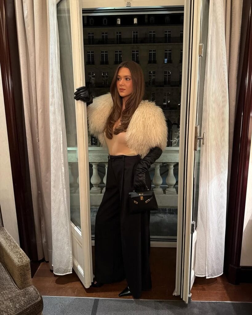 @ sophiesuchanSheās rocking pure drama with a plush white faux fur shrug over a nude top and elegant black wide-leg trousers. Long black gloves and a classic mini bag create the perfect mix of old Hollywood glamour and modern winter party chic!