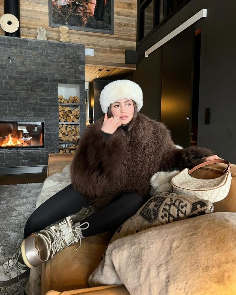 @ aydahadiSheās cozy and stylish in a voluminous brown fluffy coat, black leggings, and metallic snow boots, finished with a luxe white faux fur hat. This aprĆØs-ski look is pure winter cabin perfectionāwarm, trendy, and ready for fireside lounging!