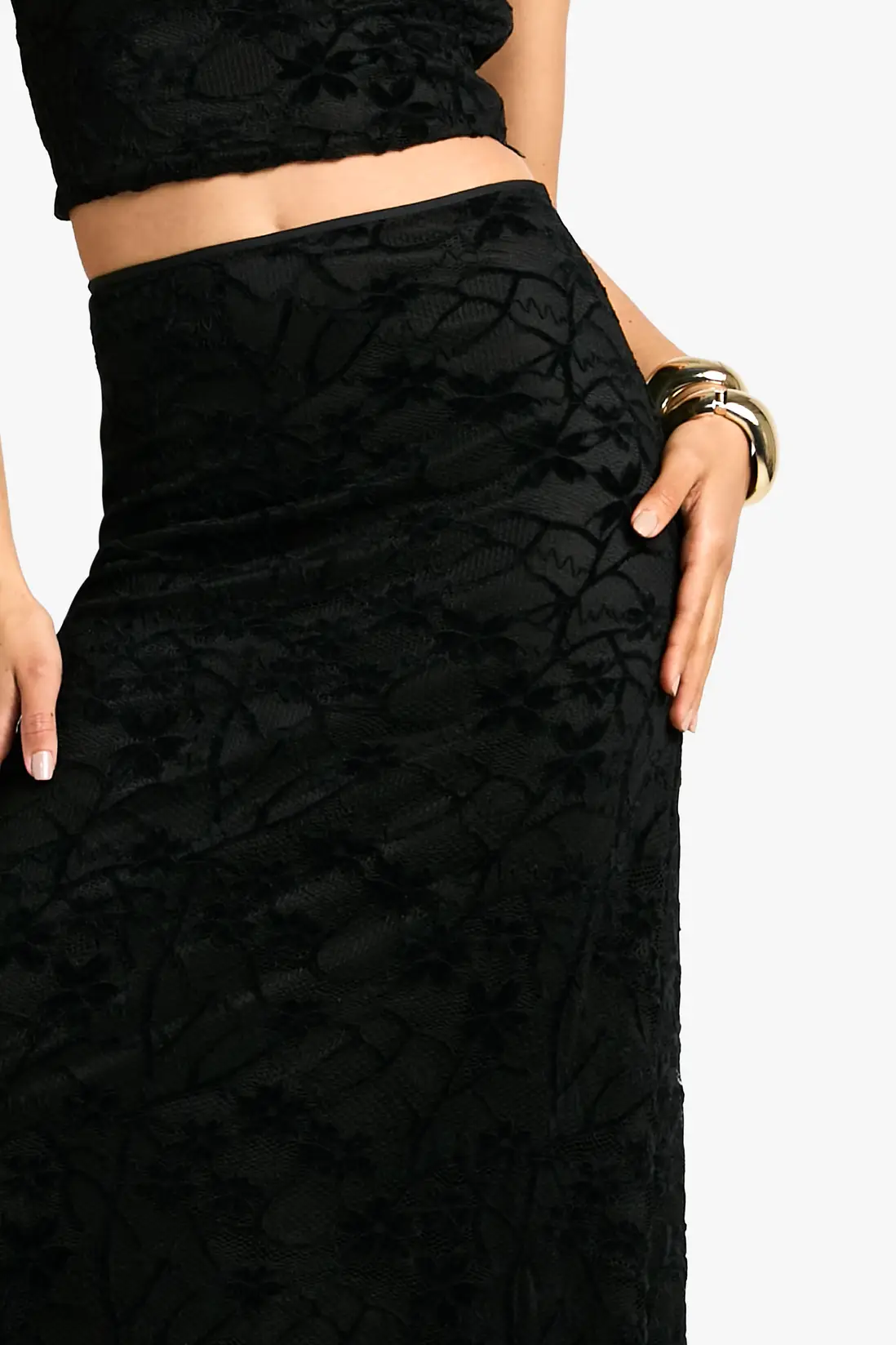 18. Feathered Black Statement Top with Velvet Maxi Skirt