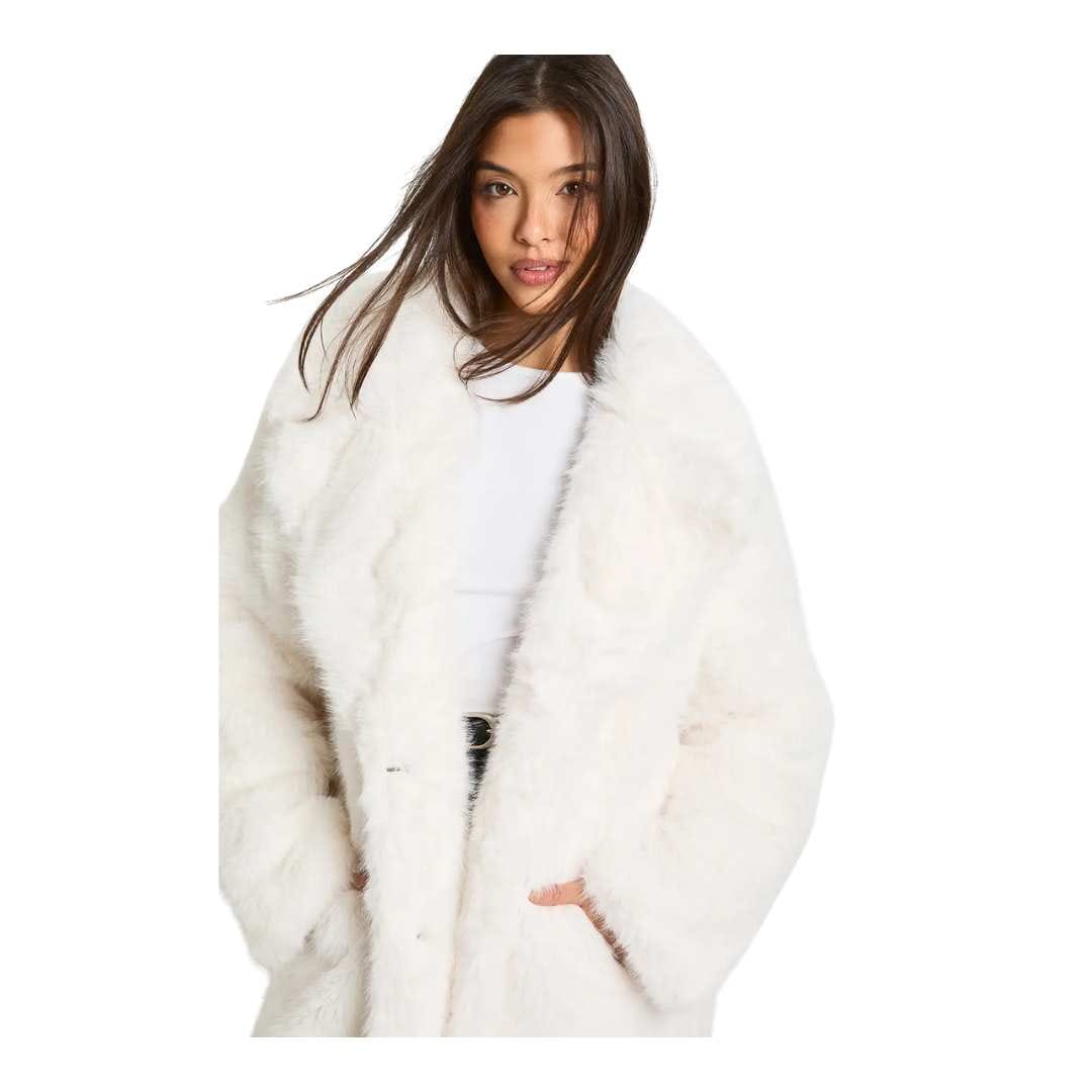 23. Soft Neutral Faux Fur Coat with White Off-Shoulder Set