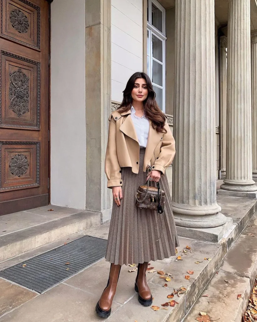 @ aydahadiThis outfit pairs a tailored beige jacket with a pleated brown midi skirt, exuding timeless sophistication. The addition of brown boots and a chic mini bag makes it perfect for casual outings or a polished office look during the winter.