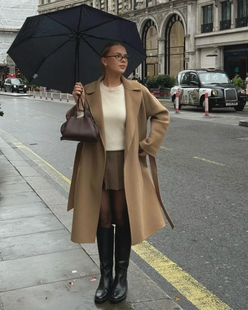 @ mildagudThis outfit combines a camel coat with a cream knit top and mini skirt, styled with sleek black knee-high boots for a polished winter aesthetic. The addition of a structured brown bag creates a chic and versatile outfit for rainy winter days.