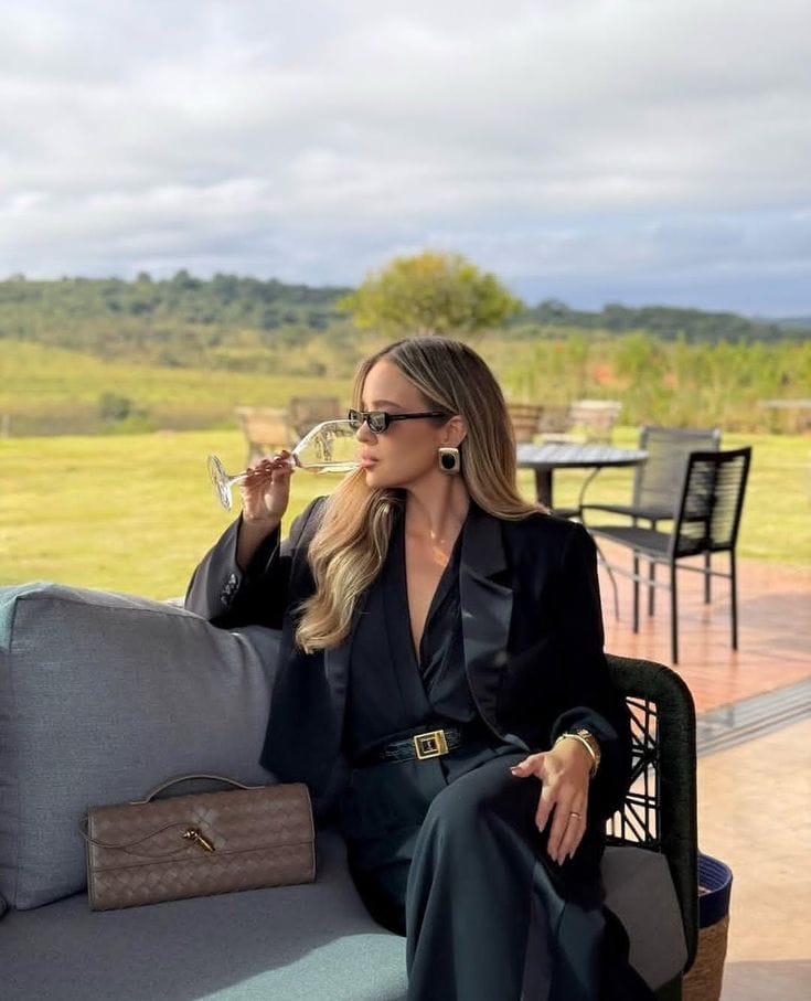 Sheās rocking a chic black tailored blazer over a matching black top and wide-leg trousers, giving full āCEO on a wine-tasting breakā energy. The look is finished with gold-accented jewelry, dark sunnies, and a glass of bubbly for that luxe touch.