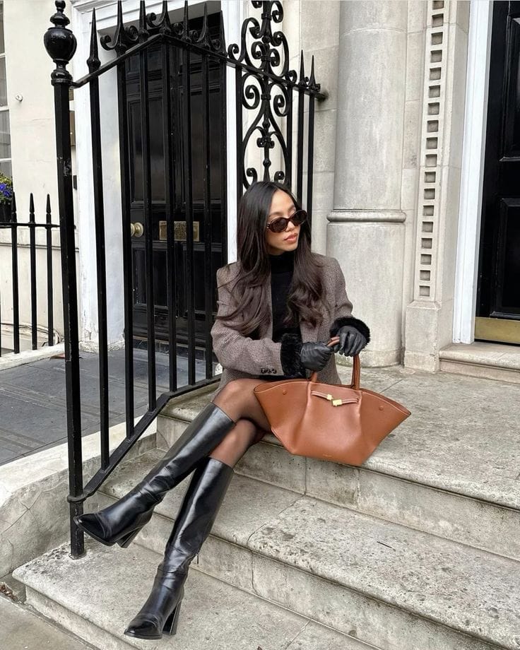 Sheās giving city-winery glam in a brown tailored blazer over a black turtleneck and short skirt, finished with sheer tights and tall black heeled boots. The leather gloves and oversized sunnies make it feel extra polished, like sheās heading from tastings straight to a cozy dinner reservation.