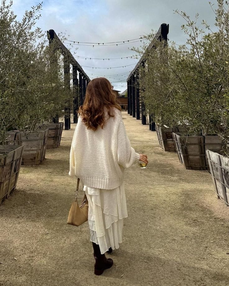 Sheās gliding through the vines in an oversized chunky cream sweater over a tiered, flowy ivory midi dress, with tall dark brown boots peeking out for a soft, romantic vibe. The neutral palette keeps everything dreamy and effortless, like you just threw it on for an afternoon of sipping and wandering.