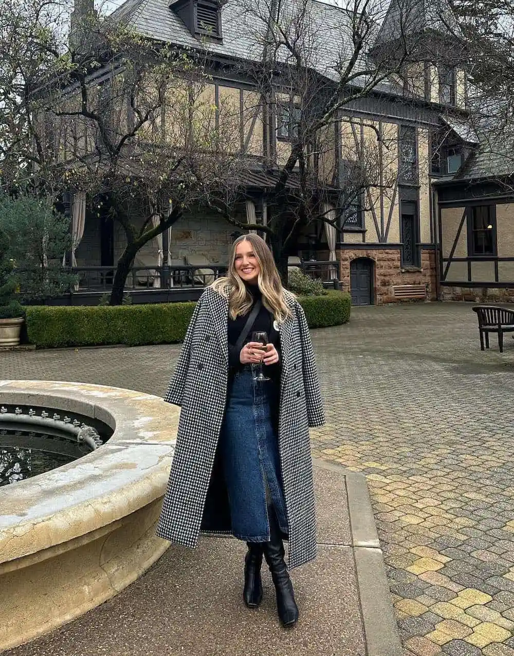 Sheās bundled in a long black-and-white houndstooth coat layered over a black top and a front-slit denim midi skirt, finished with tall black boots. Itās that perfect mix of classic and cozy, like youāre ready for a full day of tastings and exploring the estate grounds.