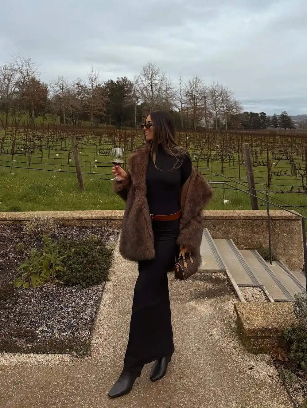 Sheās serving vineyard glam in a rich brown faux fur jacket over a fitted black top and long black skirt or pants, grounded with pointed black boots. The warm belt, mini bag, and slim sunglasses keep it looking super polished while she sips her red.