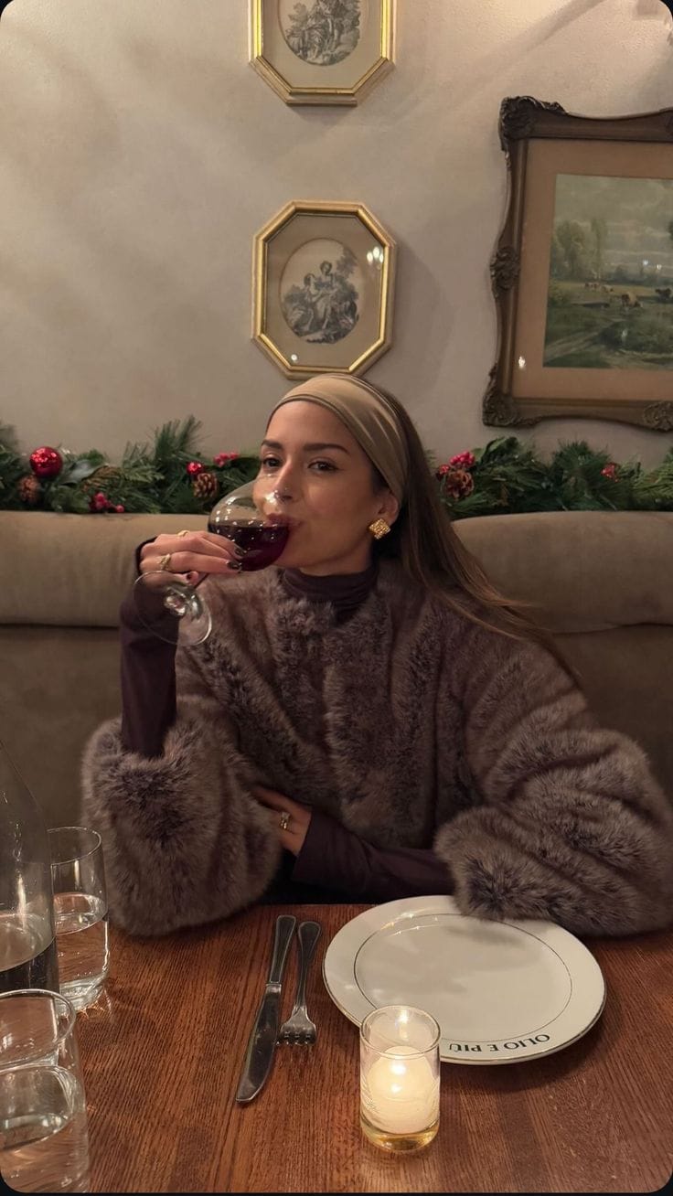 Sheās all dressed up in a soft brown faux fur jacket over a fitted dark turtleneck, giving major cozy-luxe energy for a winery dinner. The matching headband, gold earrings, and simple makeup keep it elegant and warm while she sips her red by candlelight.