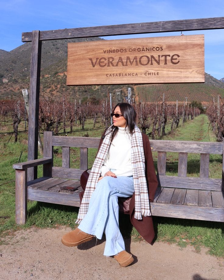 Sheās keeping it casual-cute in a cream turtleneck with light-wash flared jeans, topped with a long brown coat and a draped plaid scarf for that layered, vineyard-weekend feel. The tan boots and sunglasses make it look like the easiest outfit to throw on for a sunny but chilly tasting day.