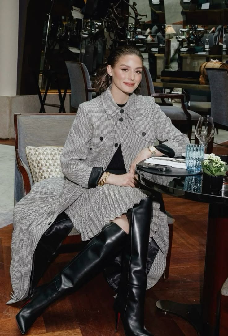 Sheās glowing in a long, structured gray coat layered over a cream cardigan and matching high-waisted pants, keeping everything sleek and tonal underneath. The pointed cream boots and layered gold jewelry make it feel like the perfect āsip wine, stroll cobblestone streetsā city-winery moment.