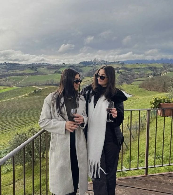 The friend on the left is in a soft, long light-beige coat over a black base, keeping it simple and polished for a vineyard stroll. On the right, the other friend pairs a black leather jacket with dark pants and a big white scarf, adding that cool-girl contrast while still staying super snug with sunglasses and a glass of red.