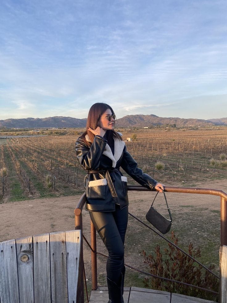 Sheās bundled up in a belted black leather jacket with cream shearling trim over fitted black pants, creating that cool-girl, moto-meets-vineyard vibe. The slim sunglasses and simple accessories keep it minimal and polished, perfect for golden-hour tastings on the deck.