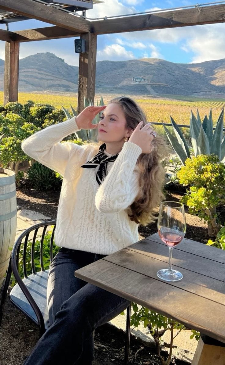 Sheās rocking a creamy cable-knit sweater with dark wash jeans, keeping things warm but still super put-together for a relaxed day of wine tasting. A printed neck scarf, casual belt, and simple jewelry pull everything together, while the setting and a glass of rosĆ© make the whole look feel extra dreamy.
