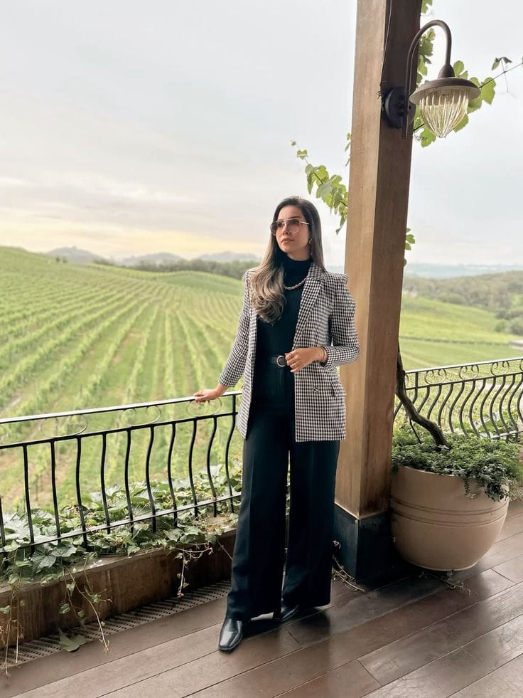 Sheās wearing a black turtleneck tucked into high-waisted black wide-leg pants, topped with a long houndstooth blazer for that polished, cozy-at-the-vineyard vibe. The look is finished with a sleek belt, minimal jewelry, and classic black boots for an effortlessly sophisticated winter winery outfit.