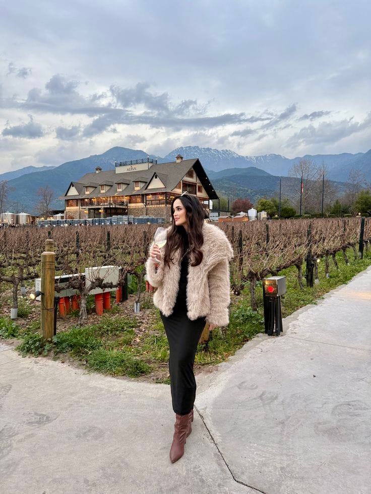 Sheās wearing a soft, beige faux-fur jacket layered over a simple black midi dress, perfect for staying warm while still looking glam at the winery. The outfit is finished with taupe heeled boots and loose waves, giving the whole look a cozy-but-elevated winter feel.