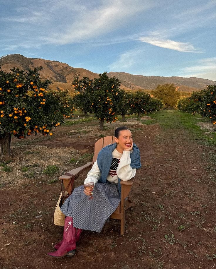Sheās rocking a cream graphic knit sweater tucked into a flowy gingham midi skirt, with a draped denim jacket adding that laid-back, countryside charm. Bold pink cowboy boots and a woven tote bring a fun, personality-packed twist that feels so cute for sipping wine among the orchards.
