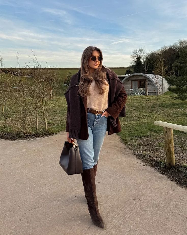 Sheās wearing a soft taupe knit sweater tucked into light-wash skinny jeans, layered with an oversized dark brown coat for that luxurious, countryside-winery warmth. Tall brown suede boots, a structured bag, and a classic leather belt tie everything together into an effortlessly chic winter look.
