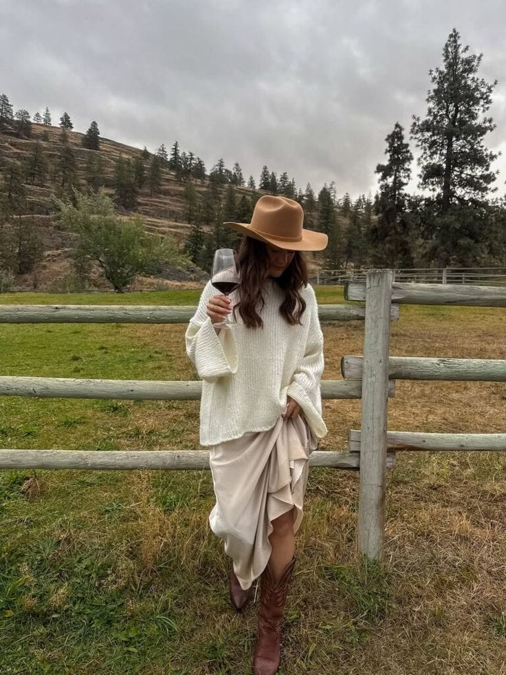 Sheās rocking an oversized ivory knit sweater half-tucked into a drapey champagne satin maxi skirt for a dreamy, romantic vibe. Brown knee-high boots and a wide-brim hat give the outfit a rustic winery twist that still feels super polished.