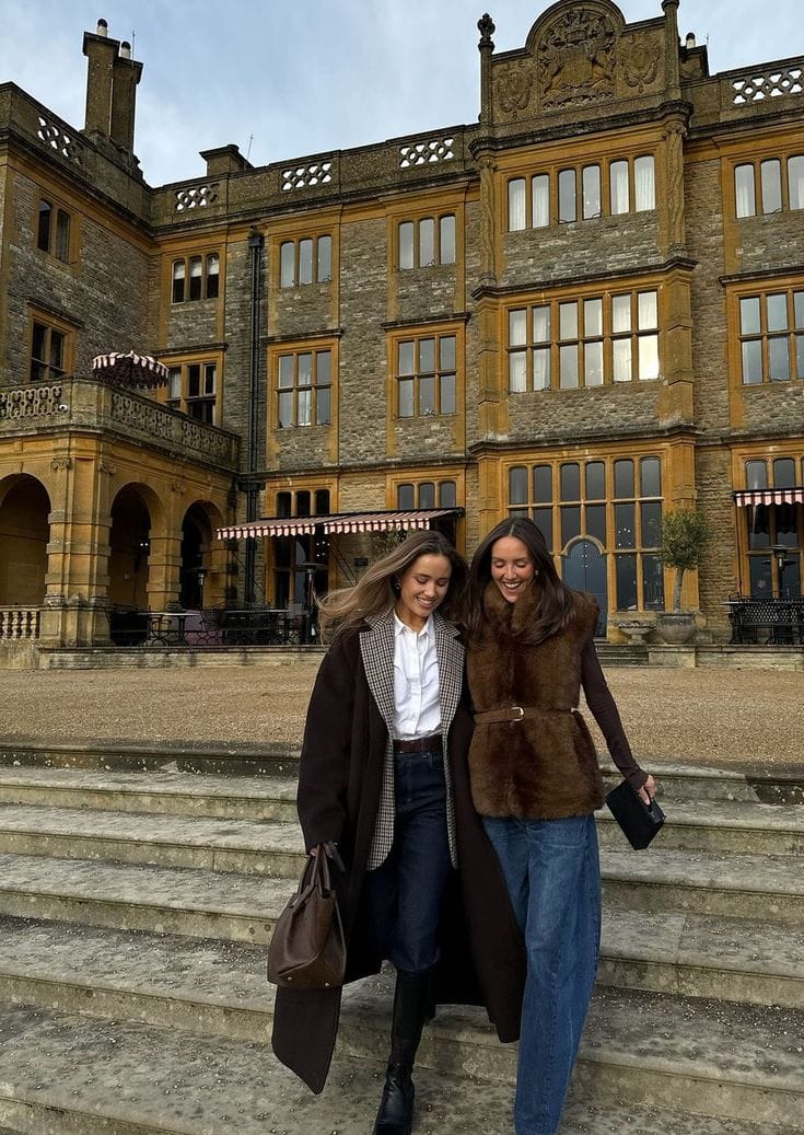 On the left, sheās layered a long chocolate coat over a checked blazer, white blouse, straight dark jeans, and black knee-high boots for that effortlessly polished countryside vibe. Her friendās in a rich brown fur-front coat cinched at the waist with wide blue jeans, keeping it chic and cozy for castle steps and crisp air.