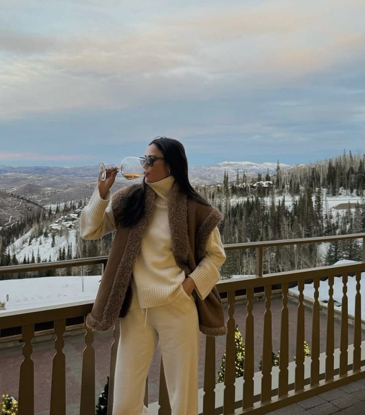 Sheās serving luxe ski-chalet energy in a chunky cream turtleneck sweater with matching knit joggers, topped with an oversized camel shearling vest. The look stays laid-back but elevated, perfect for sipping wine on the balcony while you take in those snowy mountain views.