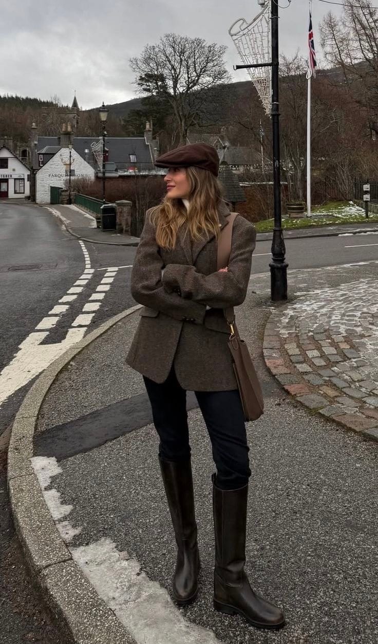 Sheās going full countryside chic in a brown tweed blazer over a light turtleneck with slim dark trousers and tall brown riding boots. The matching cap and crossbody bag make it feel like the perfect outfit for wandering through a storybook village between tastings.