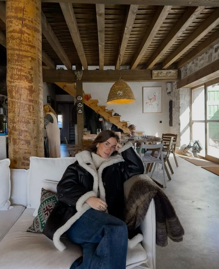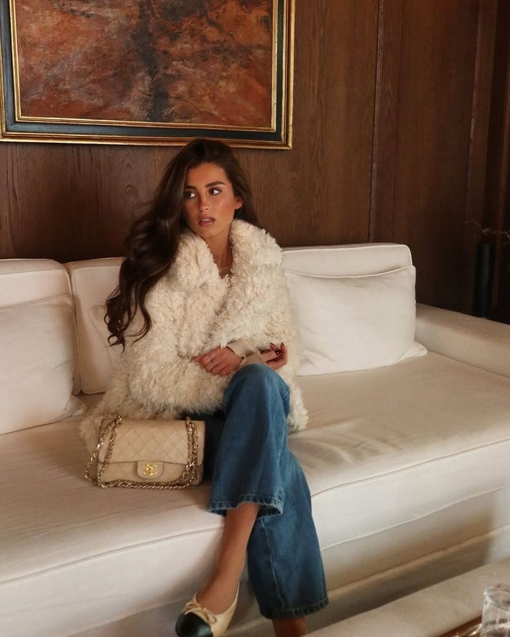 Sheās curled up in a plush off-white shearling coat paired with straight-leg blue jeans, giving total cozy-luxe lodge energy. The soft ballet flats and classic quilted bag keep it feminine and polished, like you just stepped away from the fireplace for one more pour.