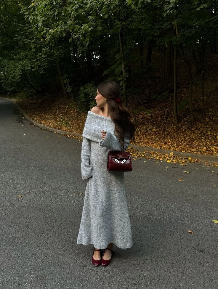 Sheās wrapped up in a soft gray off-the-shoulder knit maxi dress that drapes perfectly while still keeping her warm. The deep red bag, matching Mary Jane heels, and ribbon in her hair pull the whole look into this dreamy, old-movie-walk-through-the-vineyards moment.