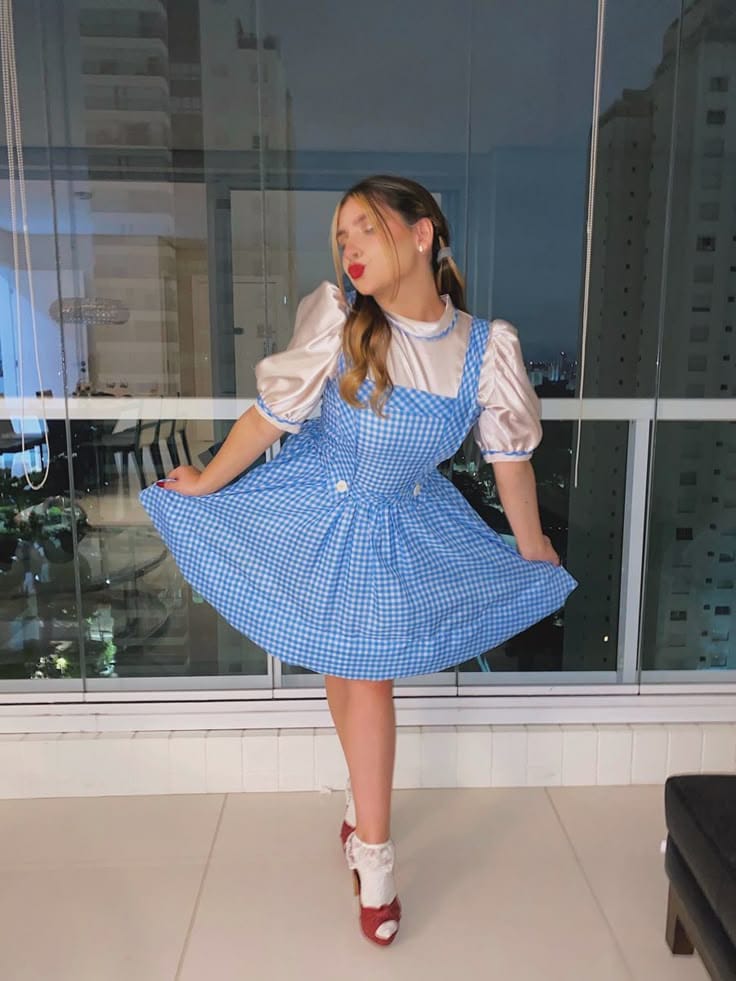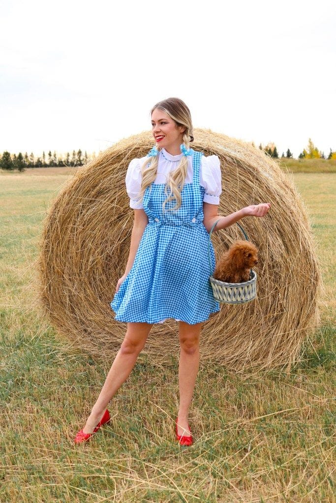 This outfit is an iconic representation of Dorothy from The Wizard of Oz, complete with blue gingham dress, white blouse, and red shoes. Carrying a basket with Toto adds authenticity and charm to the classic look. The braids and blue bows in the hair perfectly capture Dorothyās sweet and adventurous spirit.ā