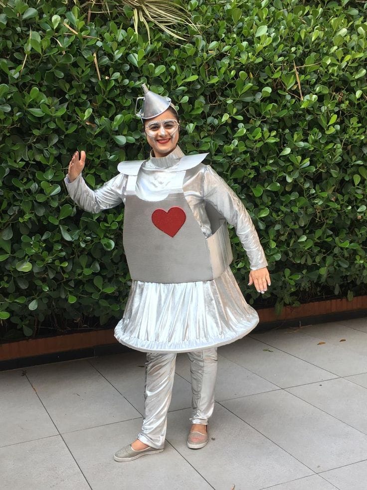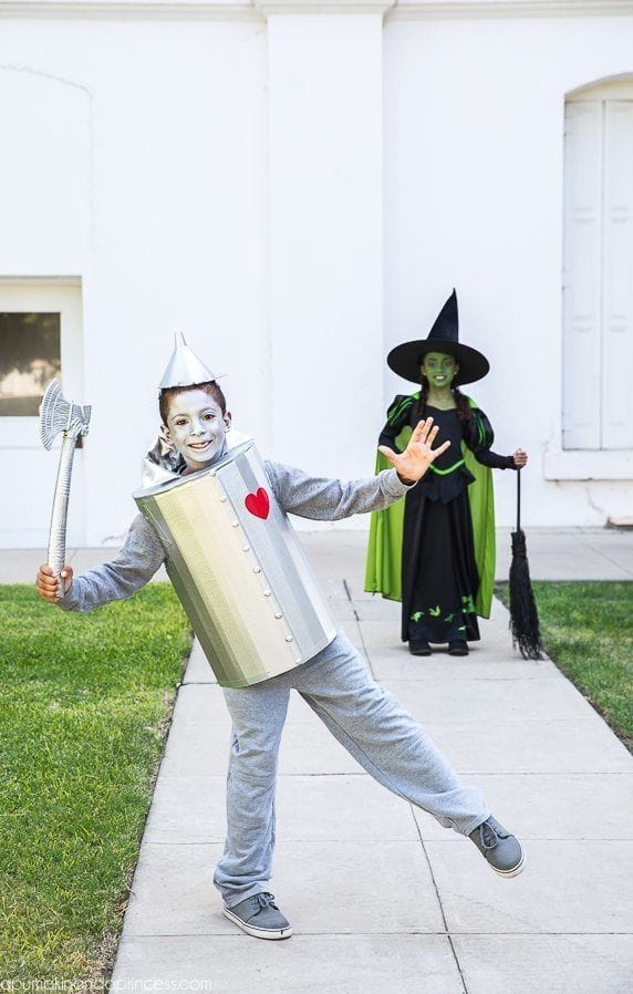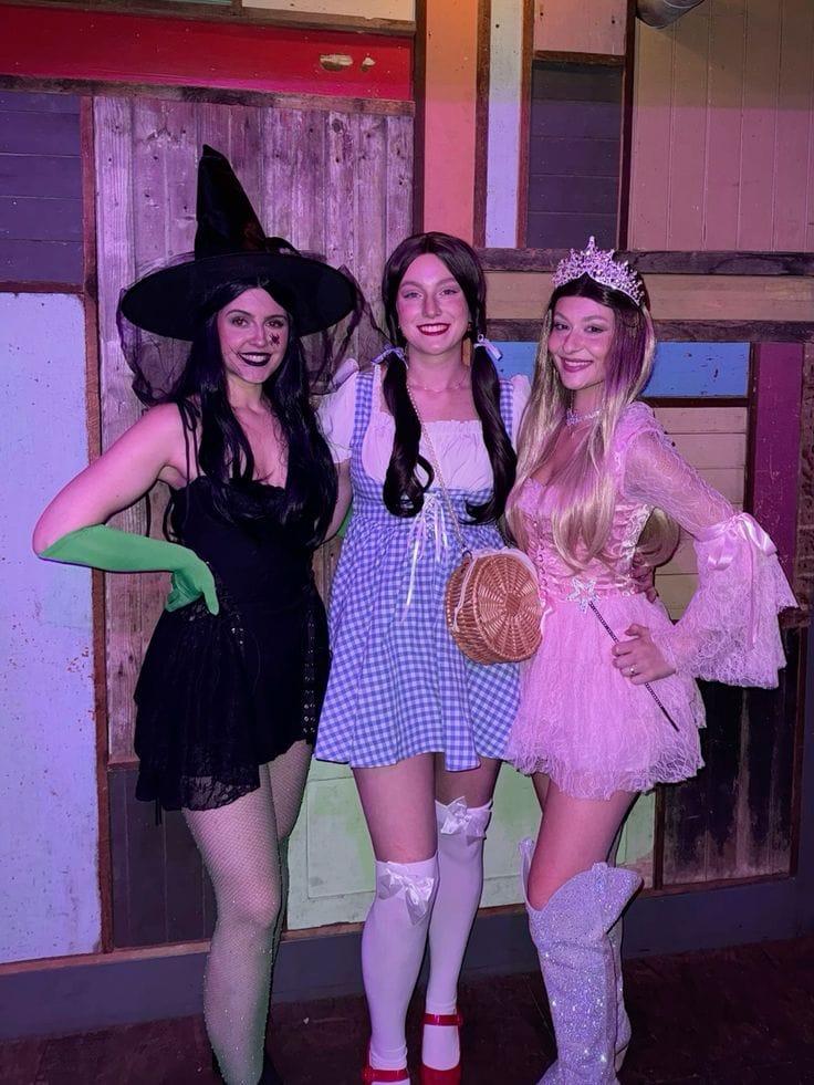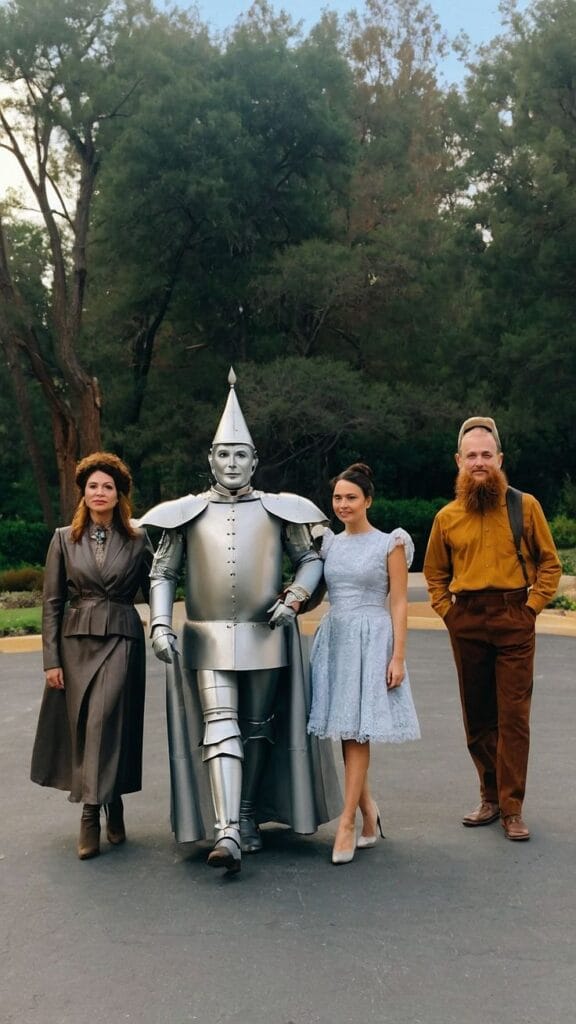 This photo captures the playful energy of Wizard of Oz costumes, featuring a spirited Tin Man with a silver body, funnel hat, and heart detail, striking a fun pose. The Wicked Witch stands confidently in her classic black dress, pointed hat, and vibrant green accents, complete with a broom for a magical touch.