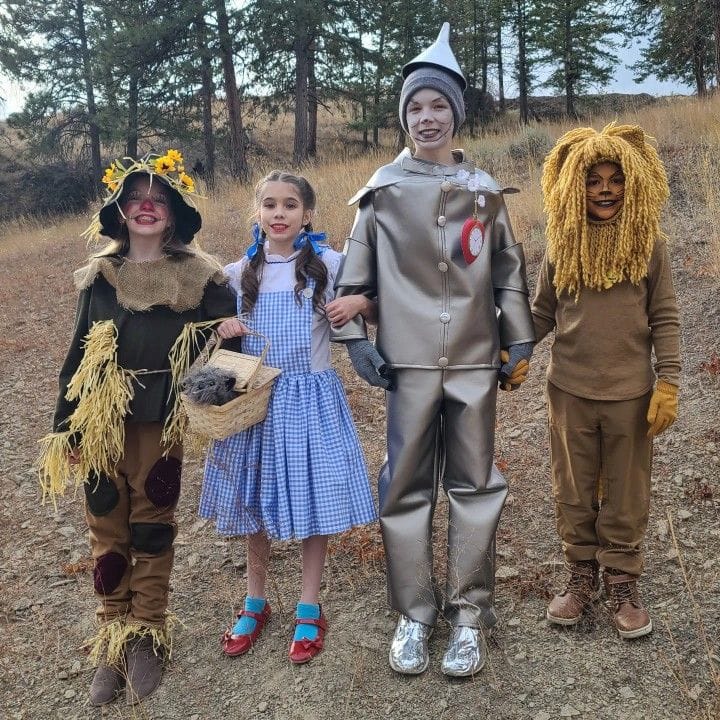 This photo features a wonderful group costume inspired by The Wizard of Oz, with four children dressed as the Scarecrow, Dorothy, the Tin Man, and the Cowardly Lion. Each costume is thoughtfully detailed: the Scarecrow with straw and flower accents, Dorothy in her blue gingham dress and ruby slippers carrying a basket, the Tin Man in shiny silver attire with a funnel hat, and the Lion in a furry mane and tail.