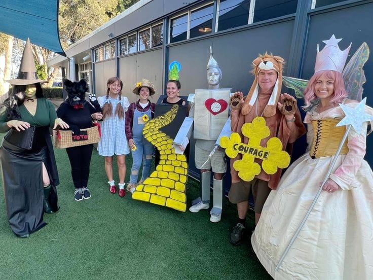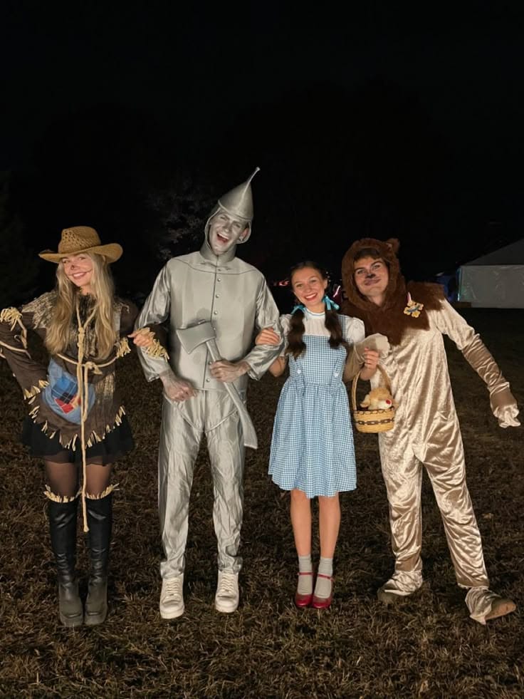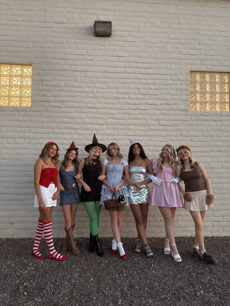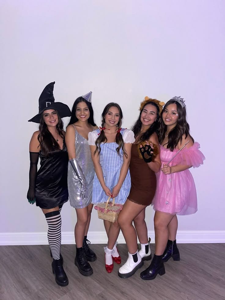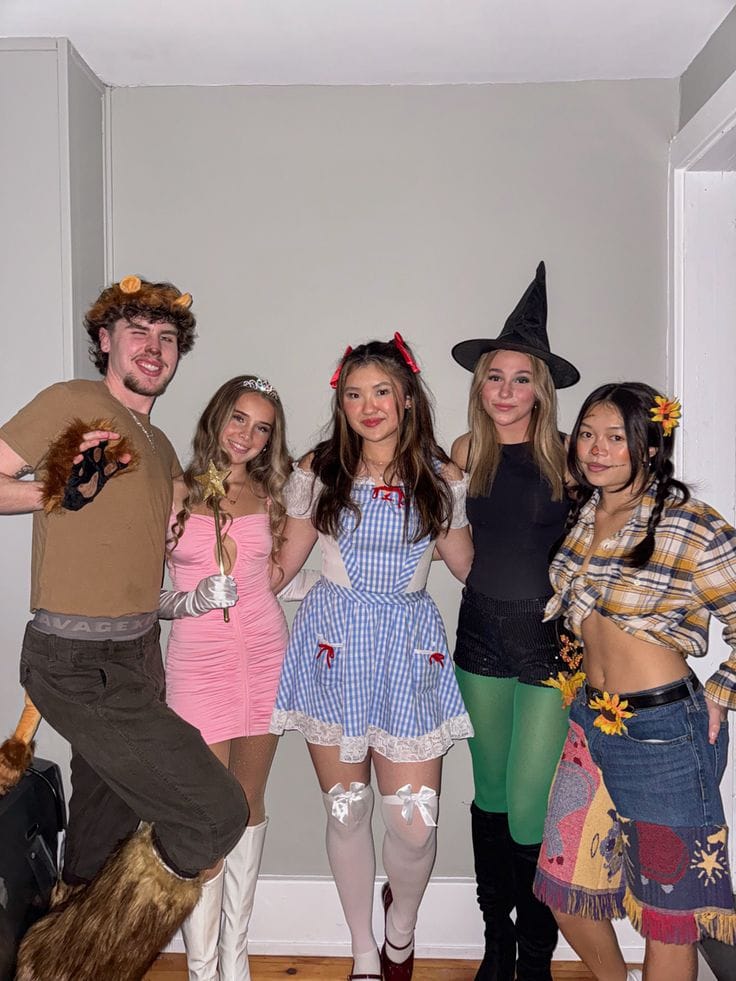 This group brought The Wizard of Oz to life with a fun and modern spin. The costumes include the Cowardly Lion (fur accessories and a tail), Glinda the Good Witch (pink dress, crown, and wand), Dorothy (blue gingham dress and white thigh-highs), the Wicked Witch of the West (black outfit and pointed hat), and the Scarecrow (plaid shirt, patchwork skirt, and straw details).