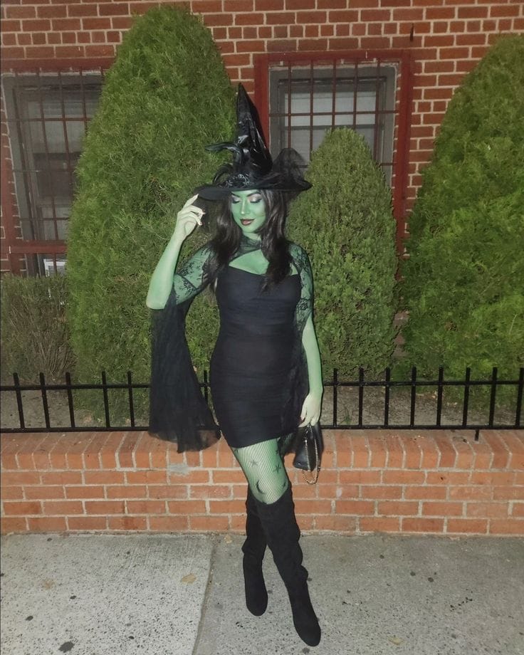 This costume is a dramatic and classic take on the Wicked Witch of the West from The Wizard of Oz. The look includes trademark green face and body paint, a pointed black witch hat, a black lace-trimmed dress, and tall black boots. With the striking green makeup and gothic style, this costume captures the villainous flair and theatrical presence of the iconic Oz character.ā